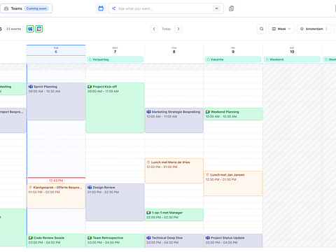 Features: View team events: birthdays, meetings, PTO. Color-coded labels for easy filtering. Daily, weekly, monthly, and agenda views. Sync with Outlook, Google, and ICS calendars.